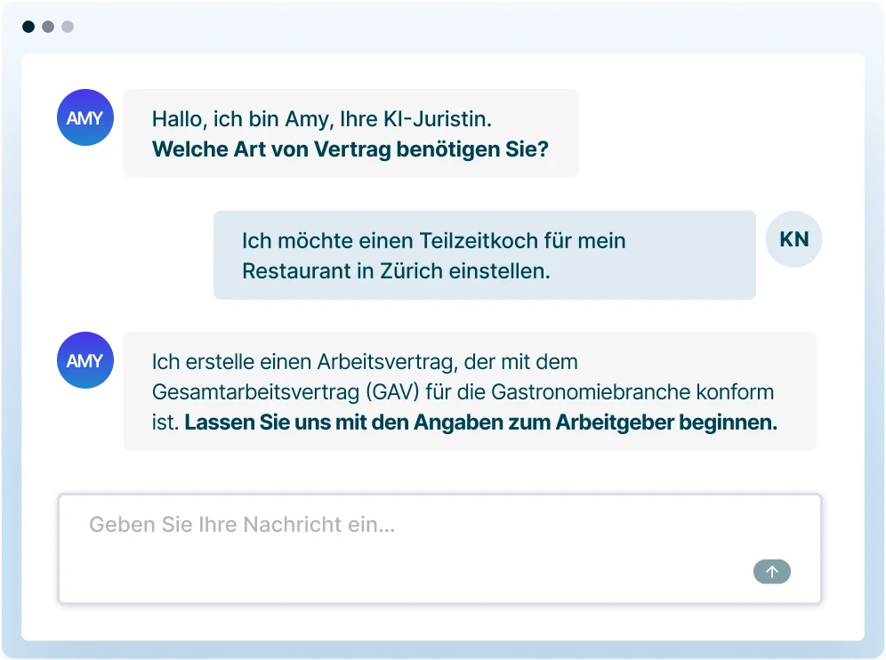 Ein Chat entspricht einer interaktiven Rechtsberatung mit der KI-Juristin Amy. Während des Chats stellt Amy Fragen, erläutert rechtliche Aspekte und erstellt Ihren massgeschneiderten Vertrag.