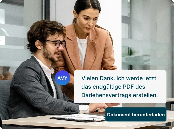 Sobald Sie Ihre Eingaben verifiziert haben, erstellt Amy ein professionell formatiertes Dokument, das genau auf Ihre Bedürfnisse zugeschnitten ist. Sie analysiert Ihre Antworten sorgfältig, berücksichtigt nur relevante Informationen und schliesst alles Unnötige aus. Das Dokument wird erst generiert, wenn alle erforderlichen Daten vorliegen. So wird sichergestellt, dass die endgültige Version, die Sie herunterladen, vollständig, korrekt und einsatzbereit ist.